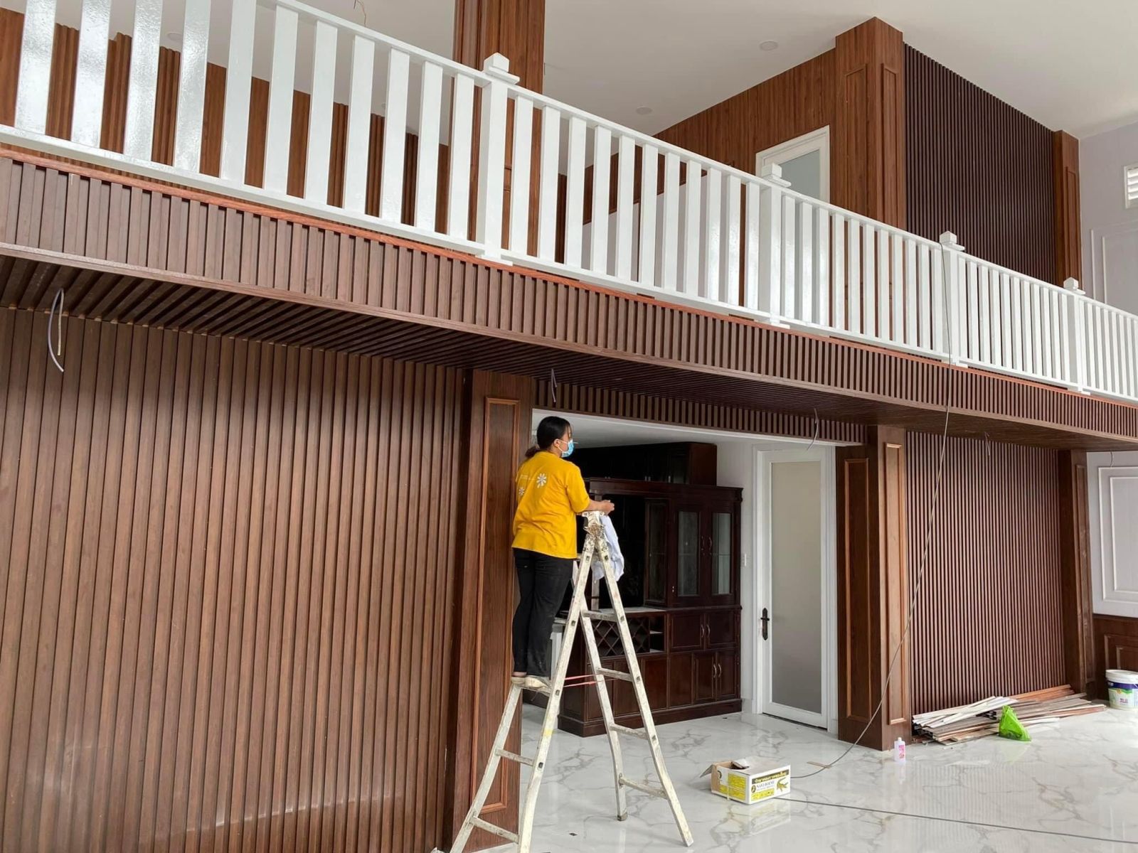 - Ưu điểm: Ấm cúng, gần gũi với gỗ thật nhưng không lo mối mọt, cong vênh.