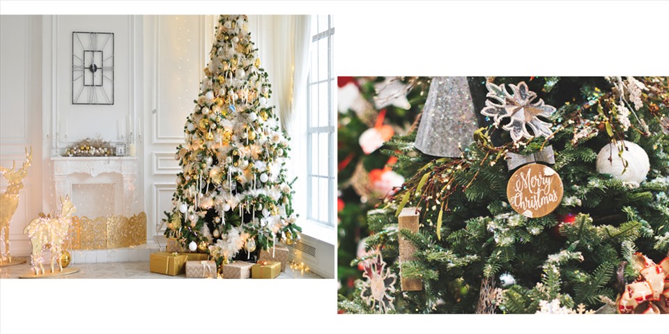 Lối ra vào đặt vào ông già Noel, trang trí tuần lộc, cây thông nhân tạo hay cây thông nhỏ, ngôi sao trang trí, hộp quà tặng để dưới gốc thông…