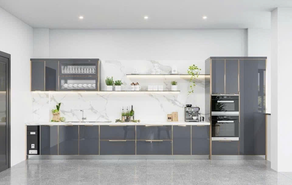 TỦ BẾP CÁNH KÍNH SƠN MÀU XÁM