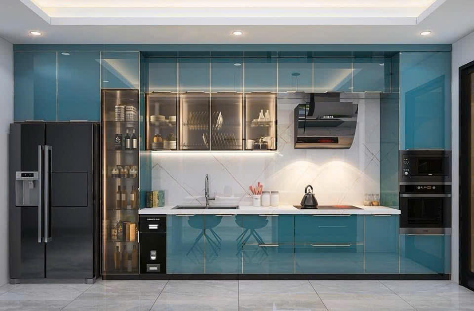 TỦ BẾP CÁNH KÍNH SƠN MÀU XANH