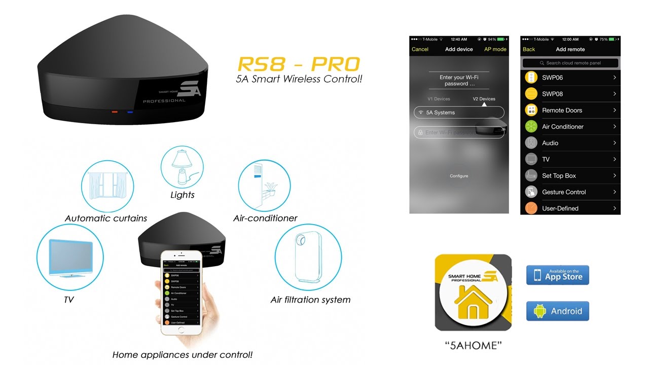 - Thiết Bị Điều Khiển Trung Tâm RS8-Pro 5A Systems kiểm soát tất cả các thiết bị RF / thiết bị làm việc trên 433MHz & 315 Mhz tần số xuyên suốt ngôi nhà của bạn.